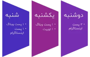از بازهی زمانی مناسب برای انتشار پستها در شبکههای اجتماعی استفاده کنید، که بهمعنای انتشار پست در زمان مشخصی در هر روز است. میتوانید برنامهریزی دقیقتری داشته باشید و برای هر روز هفته نوع خاصی از پست را در نظر بگیرید. بهعنوان مثال، پنجشنبهها میتوانید نظرات کاربران و محتوای تولیدشده توسط آنها را منتشر کنید و در شنبهها معرفی محصولات جدیدتان را به اشتراک بگذارید.