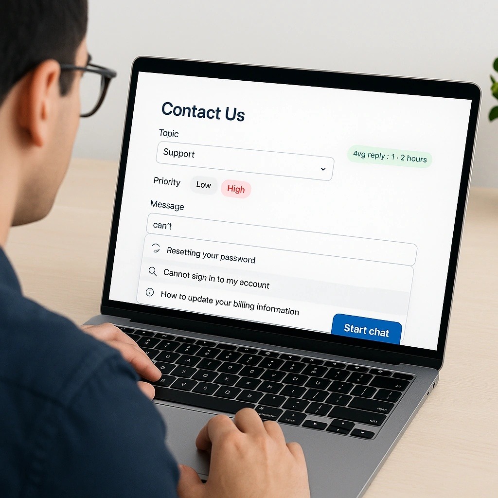 در سایت‌های برتر دنیا، صفحه تماس معمولاً خلوت است؛ چند گزینه واضح دارد و رفتار کاربر را پیش‌بینی می‌کند. مثلاً بلافاصله پس از نوشتن موضوع پیام، لینک مقاله مربوط نمایش داده می‌شود تا شاید نیازی به ارسال فرم نباشد. این طراحی تعامل‌محور، یکی از کلیدهای صرفه‌جویی زمانی است.